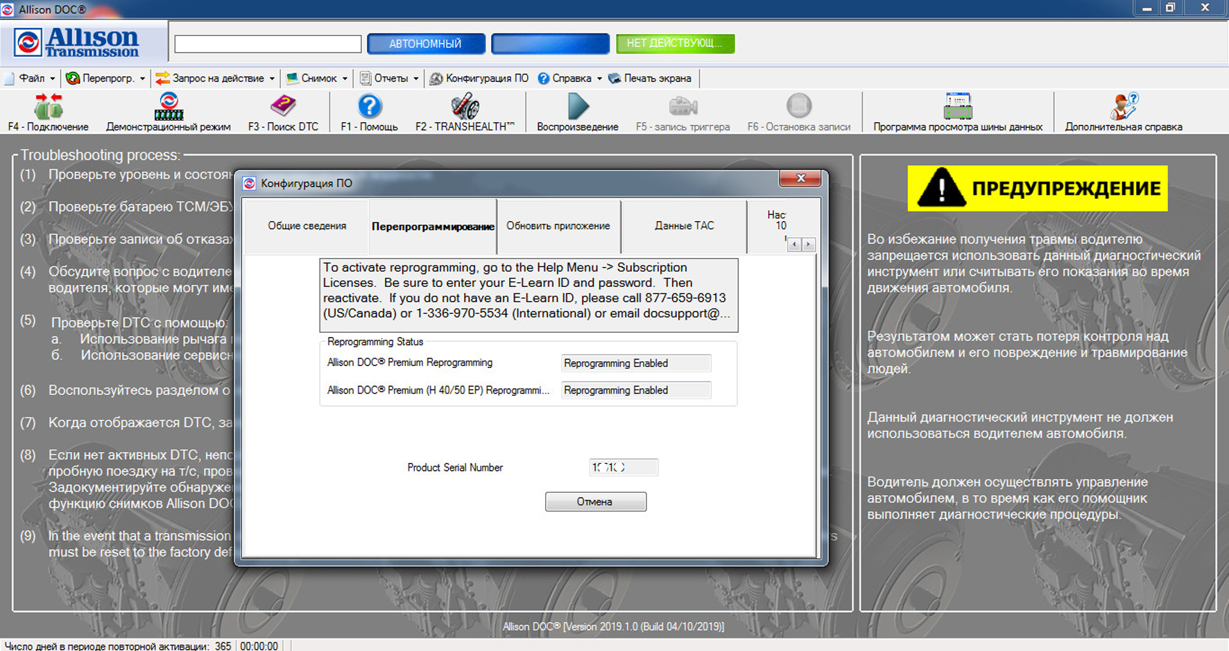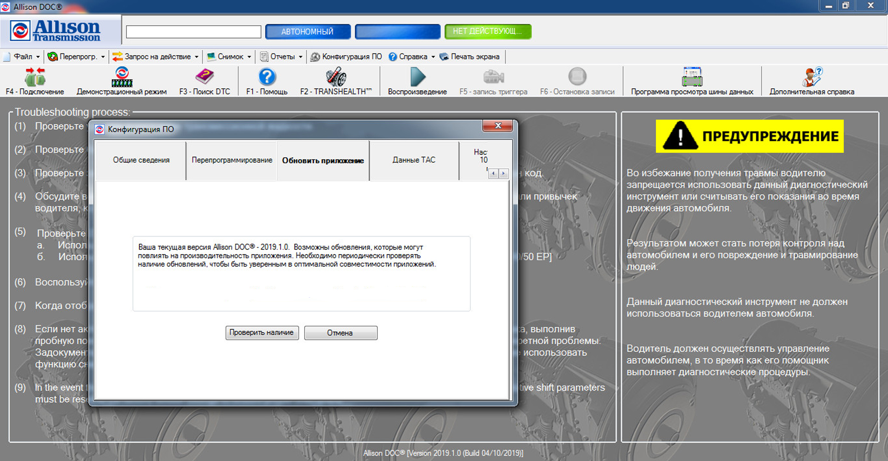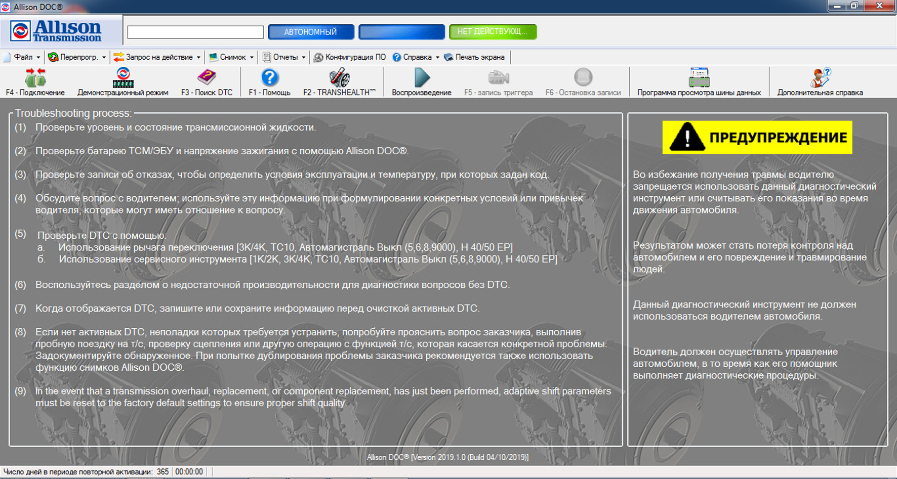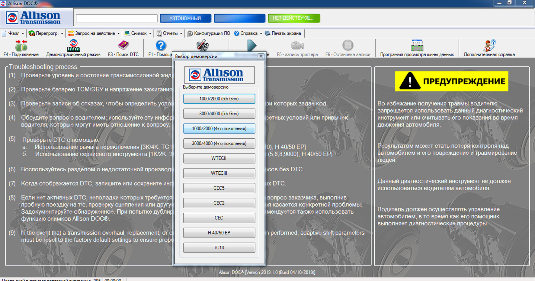 Пример работы диагностической программой Allison DOC 2019 V3.0 GEN5: