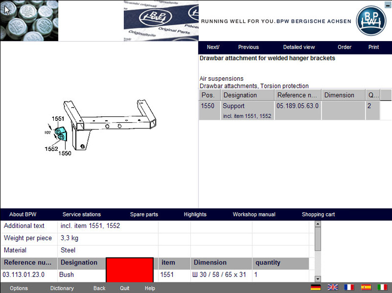 В каталоге BPW есть поиск по данным таблички моста, по группе продуктов, по оригинальному номеру детали, по типу моста, так же есть информация об интервалах и описания регламентных работ, регулировочные и настроечные параметры, моменты затяжки резьбовых соединений, смазочные работы и замена накладок.