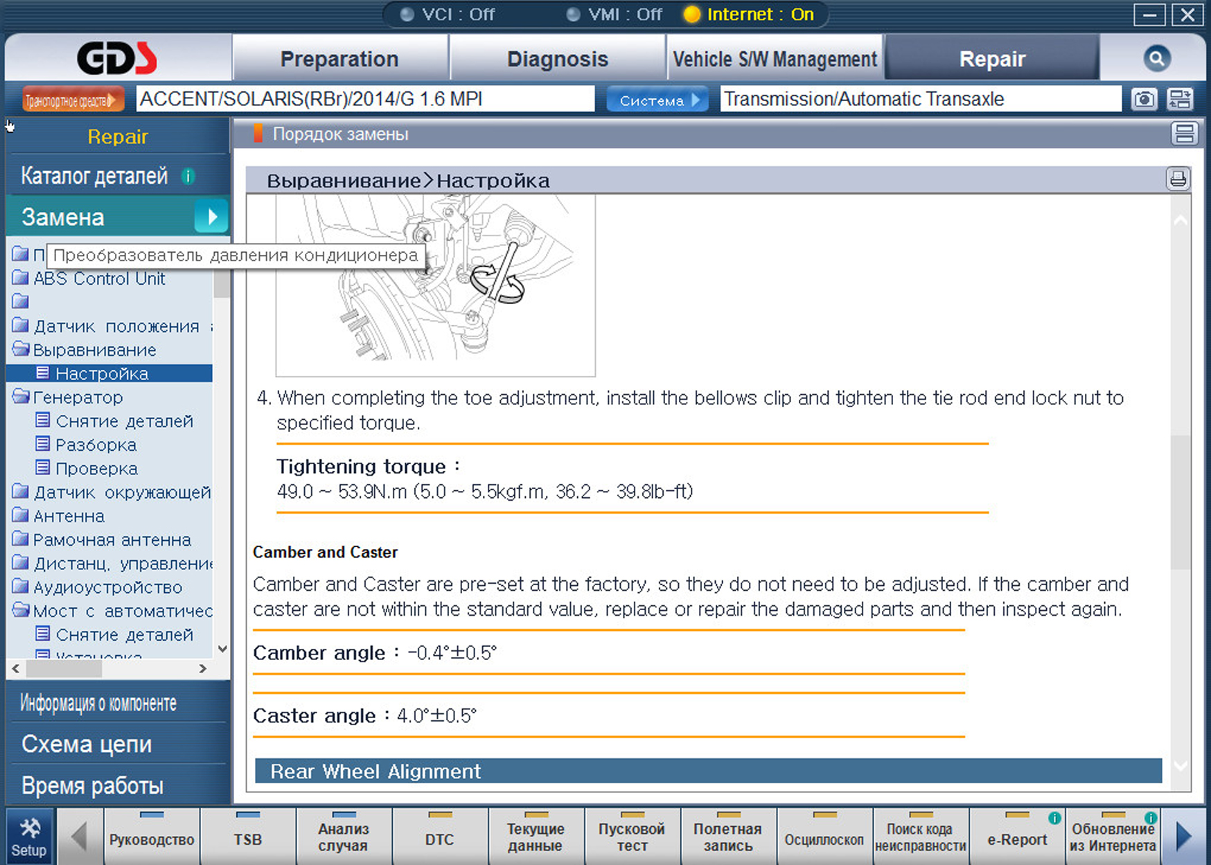 В каталоге по ремонту Hyundai GDS представлена информация по ремонту и диагностике, разборке, сборке, регулировке и настройке всех узлов и агрегатов автмобилей корейской марки Киа, представлены электросхемы Хундай, распиновка разъёмов, расшифровка диагностических кодов неисправностей DTC (Daignostic Trouble Codes), моменты затяжки, технические данные, дилерская информация по ремонту и диагностике механических МКПП и автоматических АКПП трансмиссий Хендай, необходимый специальный инструмент, а так же другая полезная информация для ремонта автомобилей марки Hyundai.