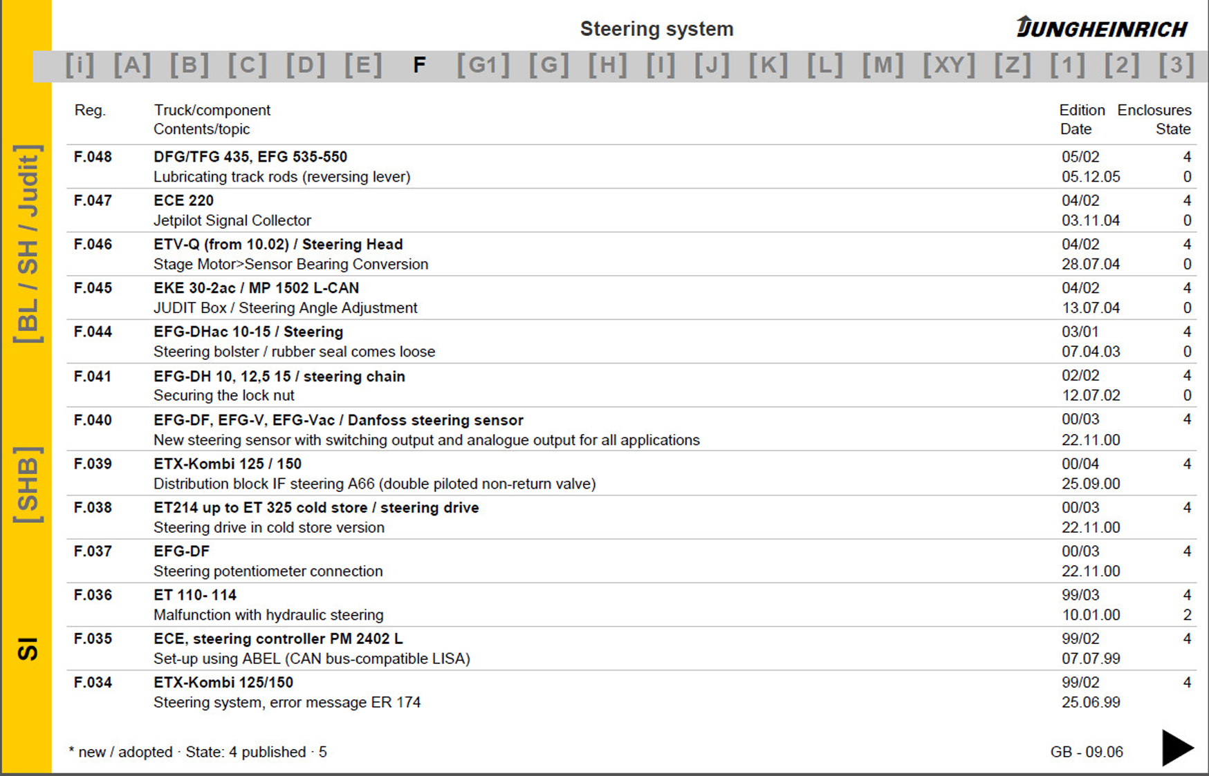 В программе по ремонту JETI SH представлены электрические схемы, гидравлические схемы, бюлетени по техническому обслуживанию, а также содержит комплексную техническую документацию для обслуживания складской техники Юнгхайнрих.