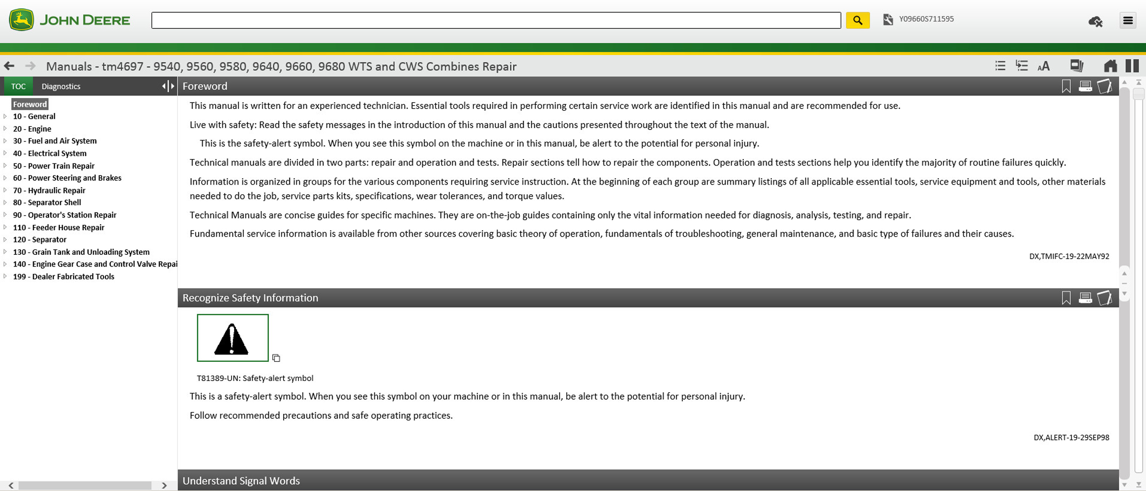 Service Advisor это руководство по ремонту в котором представлены подробные руководства по ремонту, электрические и гидравлические схемы, специальные инструкции по эксплуатации для всех моделей техники, руководства по управлению и обслуживанию, технические характеристики и спецификации, результаты испытаний всей техники, моменты затяжек, заправочные объемы, а также каталог специального инструмента John Deere.