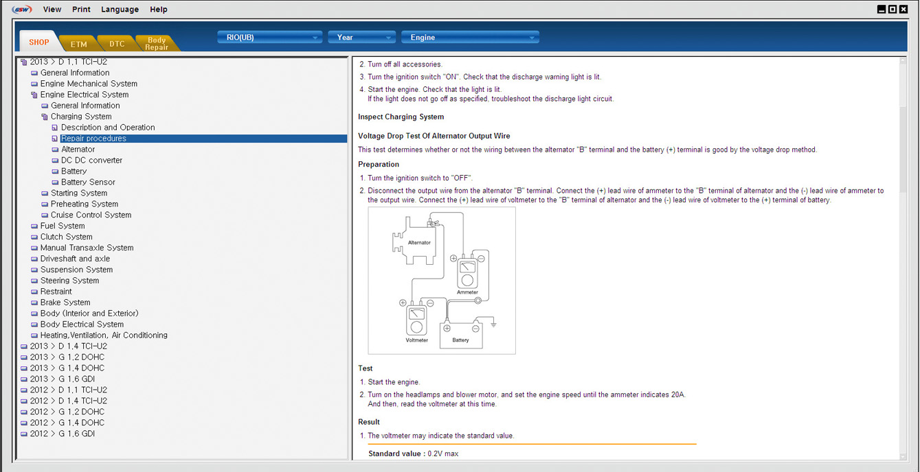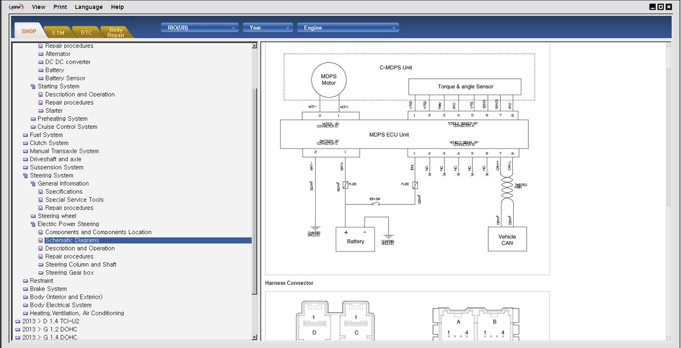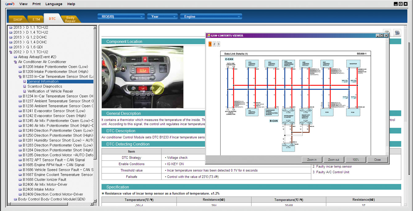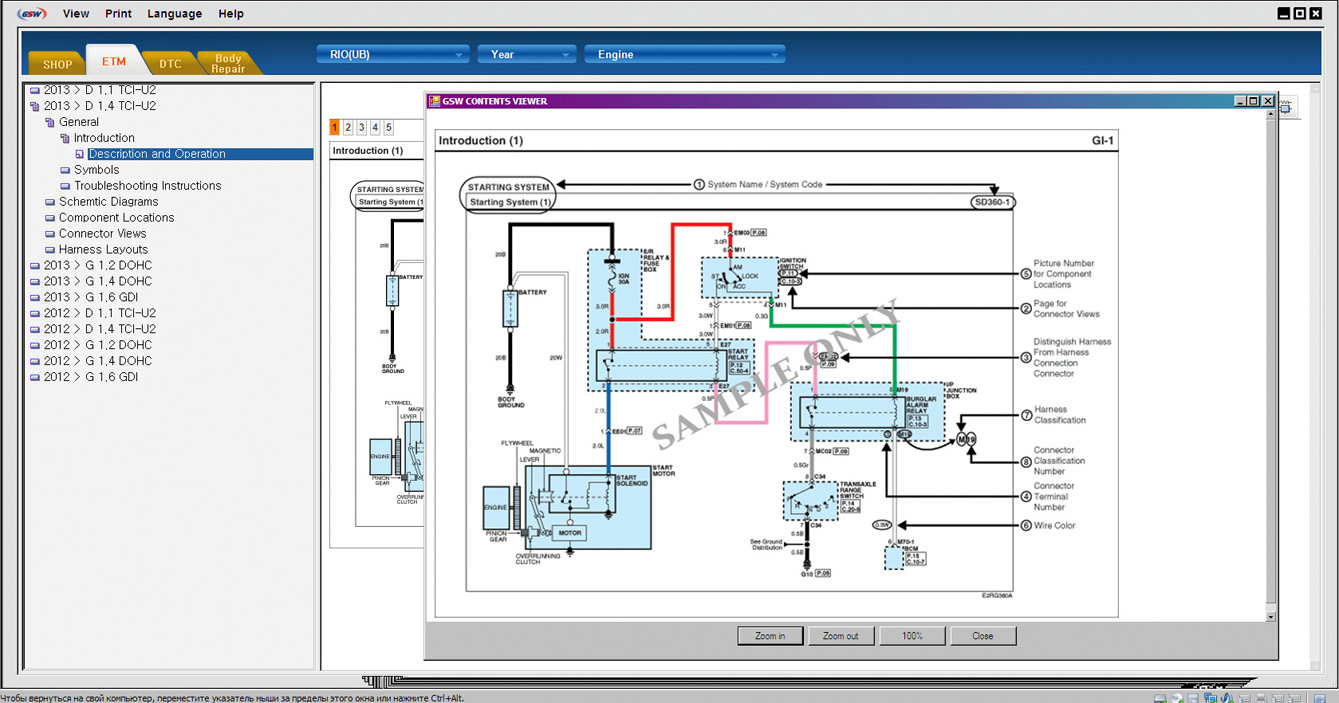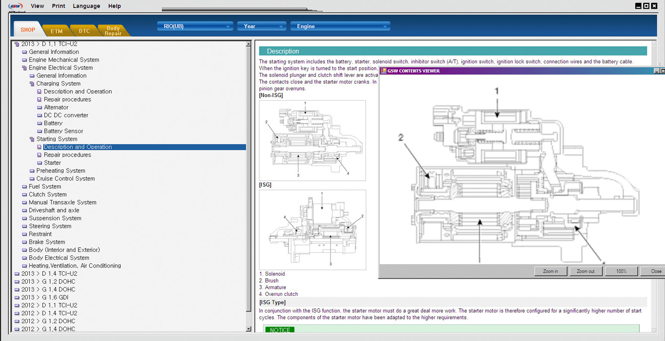 Kia GSW - Дилерская техническая документация содержит описание конструкции и устройства, характеристики, инструкции по ремонту и обслуживанию всех узлов и агрегатов, электрические схемы, инструкции по диагностике и много другой полезной информации. Программа очень похожа на Kia GDS