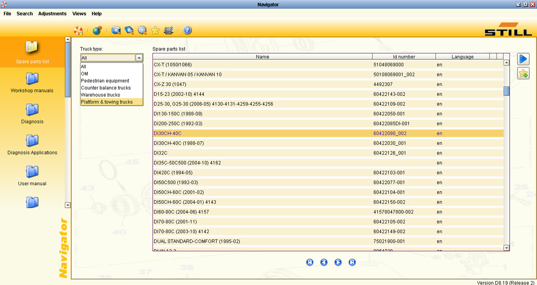 Still STEDS Navigator - это каталог запчастей, руководства по ремонту, диагностика, руководства пользователя, общая документация, списки ошибок, флэш-файлы, техническое обслуживание, электрические и гидравлические схемы